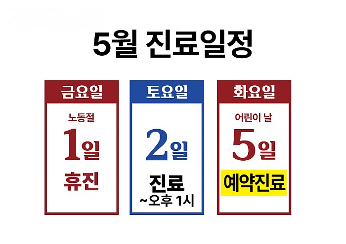 2026. 5월 진료일정 페이지 정보 작성자 THE참안과 작성일26-04-21 10:47 조회30회 댓글0건 다음글 목록 본문 5월 5일은 예약자에 한해 진료합니다. 댓글목록 등록된 댓글이 없습니다. 다음글 목록