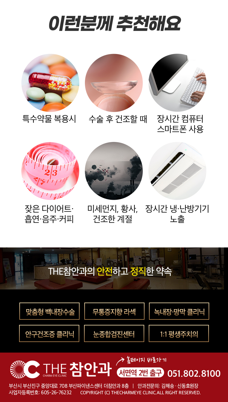 개인정보 취급방침 더참안과의원은 귀하의 개인정보보호를 매우 중요시하며, 개인정보보호방침을 통하여 귀하께서 제공하시는 개인정보가 어떠한 용도와 방식으로 이용되고 있으며 개인정보보호를 위해 어떠한 조치가 취해지고 있는지 알려드립니다. ▶ 개인정보의 수집목적 및 이용목적 더참안과의원은 다음과 같은 목적을 위하여 개인정보를 수집하고 있습니다. ο 이벤트 참여시 더참안과의원에서 수술 상담에 활용(전화, 문자) ▶ 수집하는 개인정보 항목 - 이벤트 참여시 : 이름, 연락처 ▶ 개인정보의 보유기간 및 이용기간 원칙적으로, 개인정보 수집 및 이용목적이 달성되거나 이벤트 참여시 이벤트 페이지에 별도 명시한 수집 동의 받은 날로부터 동의 받은 기간이 만료된 후에는 해당 정보를 지체 없이 파기합니다. ▶ 개인정보 관리책임자 더참안과의원은 개인정보에 대한 의견수렴 및 불만처리의 정책을 담당하는 개인정보정책 책임자를 지정하고 있습니다. 본 정책에 대한 불만사항이 있으시다면 아래 연락처로 문의하시면 친절히 처리하여 드리겠습니다. 개인정보정책 책임자: 조성희 Tel : 051-802-8100 기타 개인정보침해에 대한 신고나 상담이 필요하신 경우에는 아래 기관에 문의하시기 바랍니다. - 개인분쟁조정위원회 (http://www.1336.or.kr / Tel : 1336) - 정보보호마크인증위원회 (http://www.eprivacy.or.kr / Tel : 02-580-0533~4) - 대검찰청 첨단범죄수사과 (http://www.spo.go.kr / Tel : 02-3480-2000) - 경찰청 사이버테러대응센터 (http://www.ctrc.go.kr / Tel : 02-392-0330)